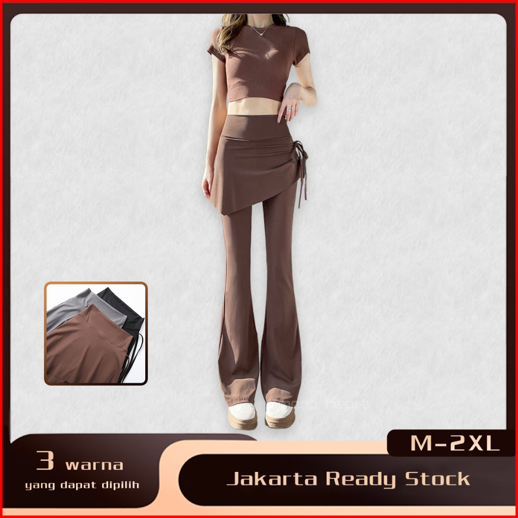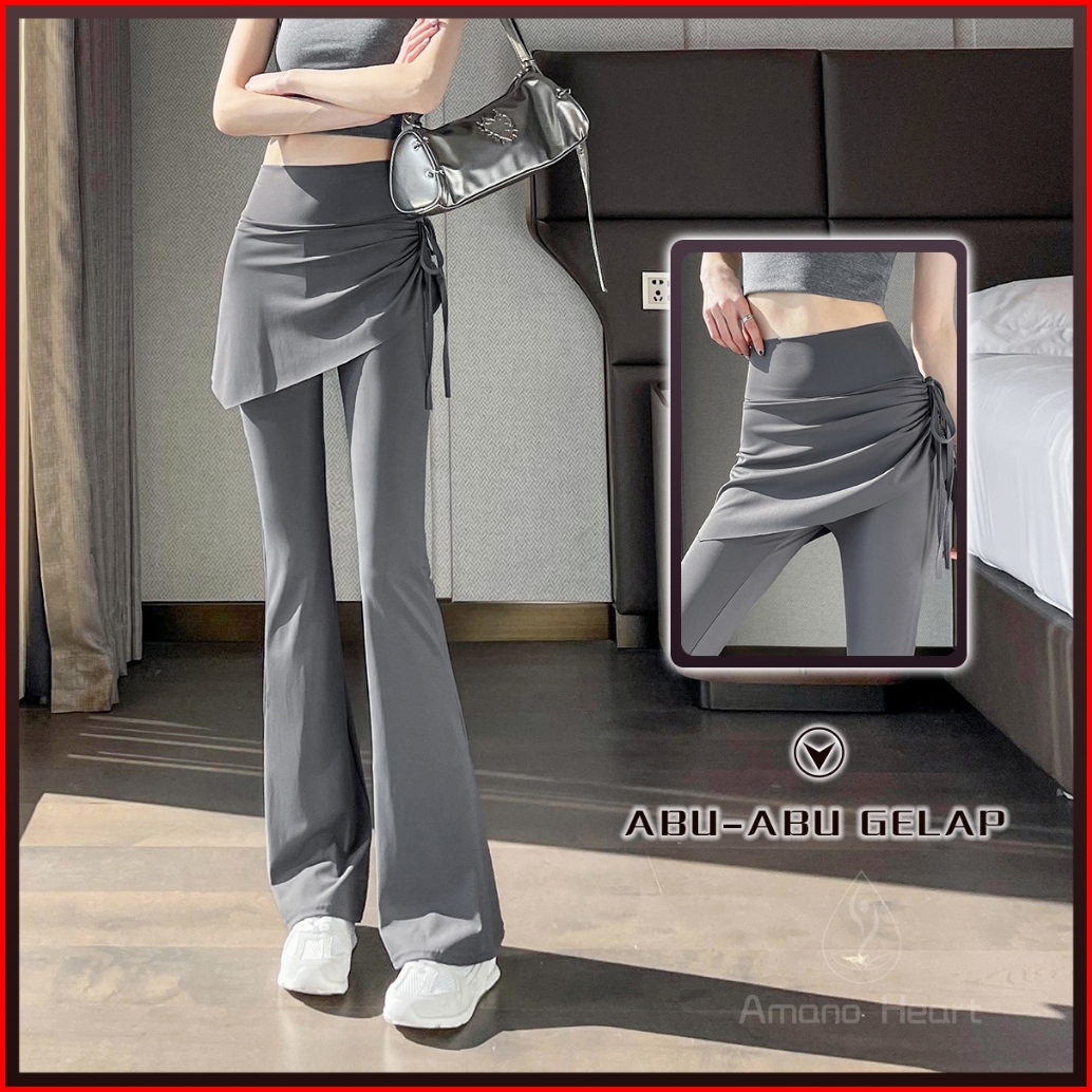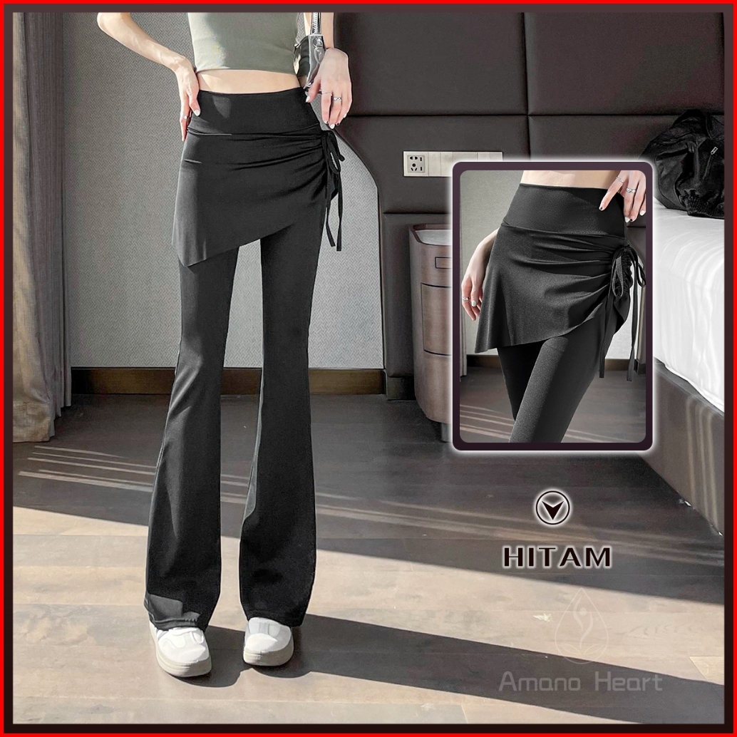 Amanoheart Celana Rok Serut 2-in-1 Legging Hitam Olahraga Celana Panjang Dengan Bagian Bawah Lonceng Wanita Rok Panjang