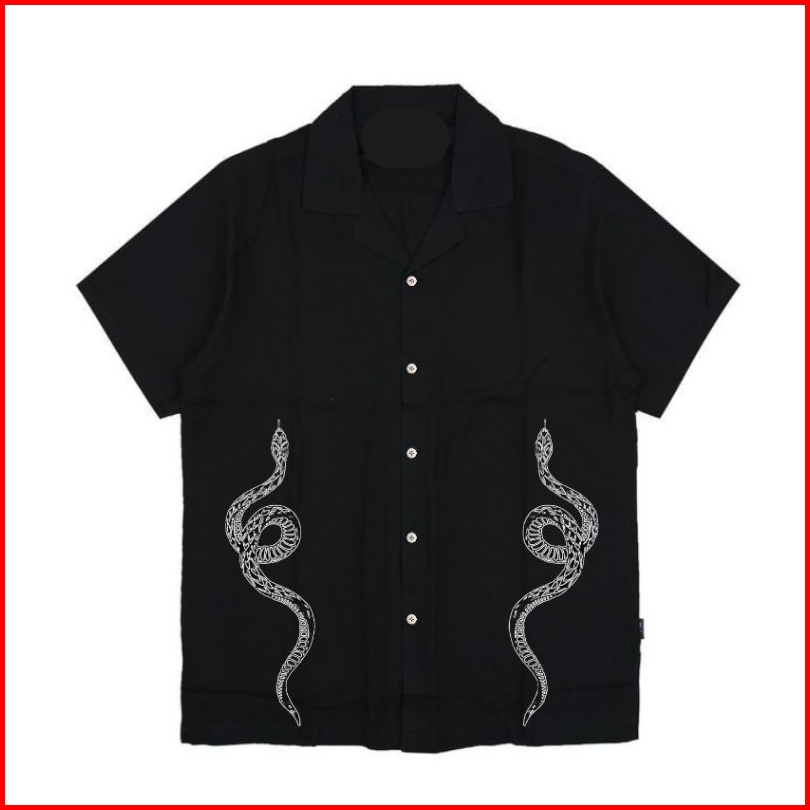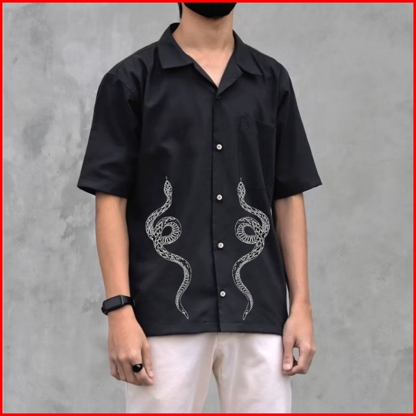 Kemeja Hitam Kemeja Pria Lengan Pendek Warna Hitam Motif Snack Two Kerah V Neck Kasual