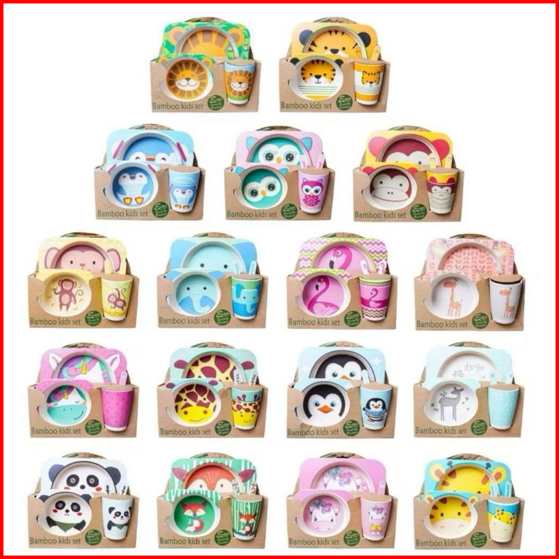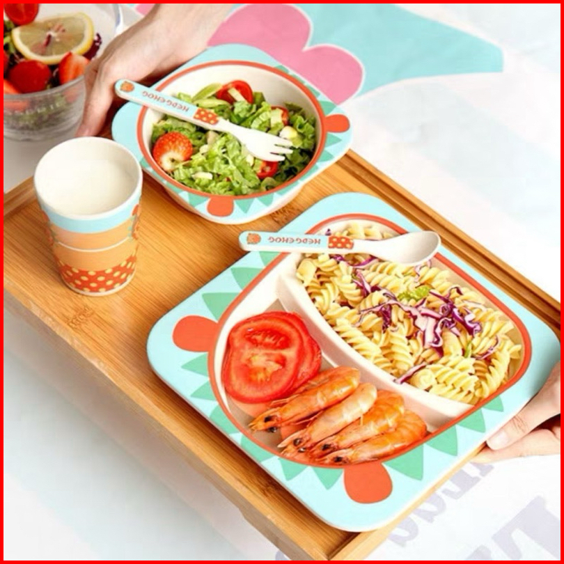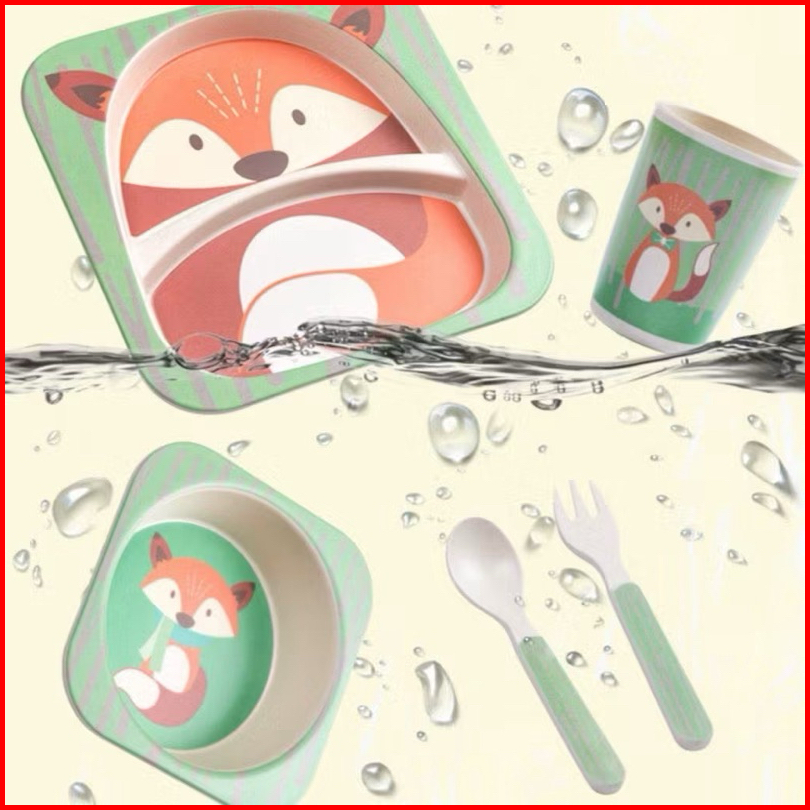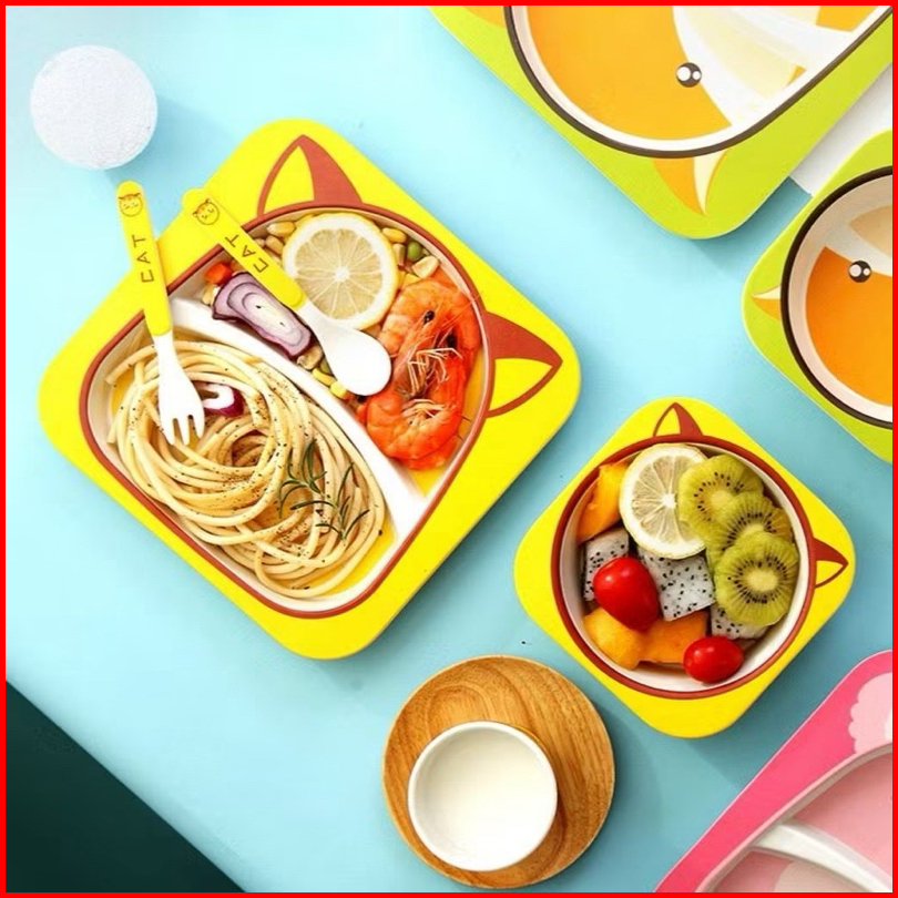 Set Alat Makan 5 In 1 Bamboo Fiber Feeding Set Persegi Karakter Lucu