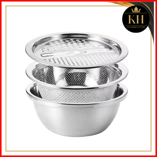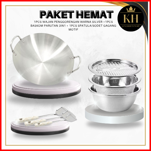 Kh - Paket Bundling Combo Hemat Wajan Silver Ukuran 30cm Baskom Parutan 3in1 Spatula Sodet Gagang Motif Hemat Murah