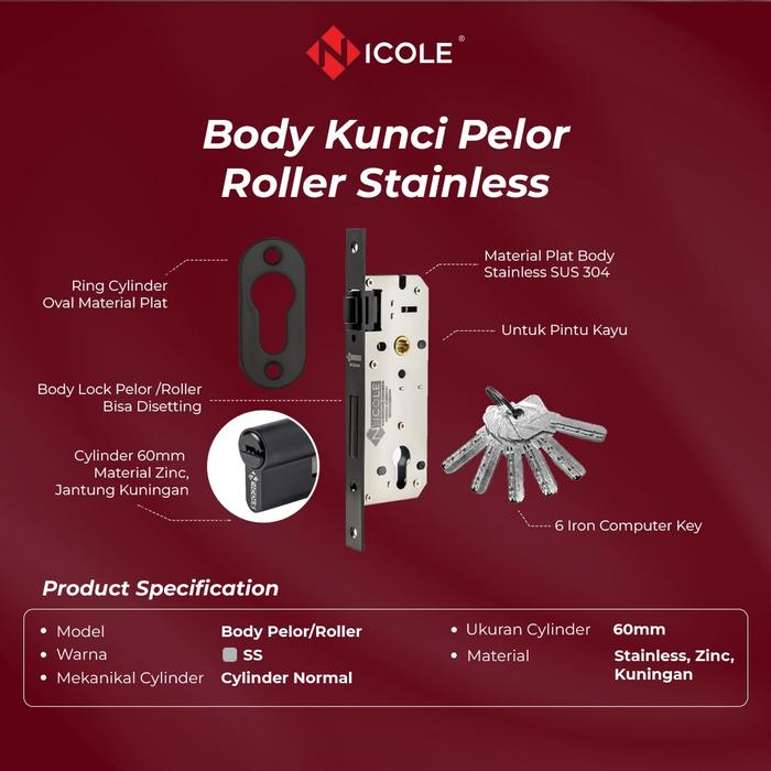 Body Pelor Roller Pintu 2 Dua + Silinder 6 Kunci 60mm Hitam - Cylinder Biasa