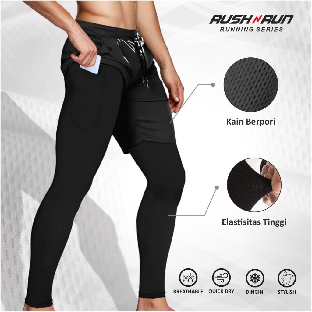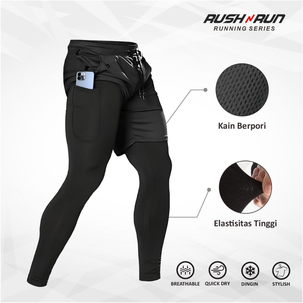 Rush N Run Celana Pendek Olahraga Pria 2 In 1 Clana Training Gym Lari Running Compression Sport