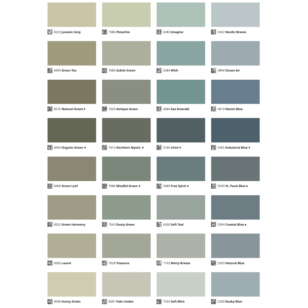 WiltshireCream, Arctic Blue, Apple White, Platinum, Brilliant White, Bermuda Pink, Comfort Grey, Violet Dreams, Timeless, Antique White 1016