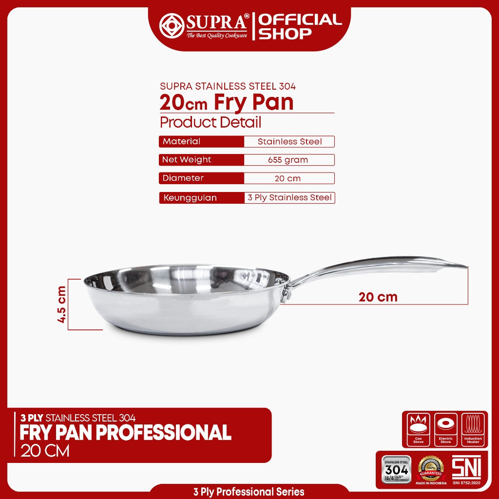 SUPRA Panci Wajan Penggorengan 3 PLY Stainless Steel SUS 304 Frypan 20 Cm Professional Series