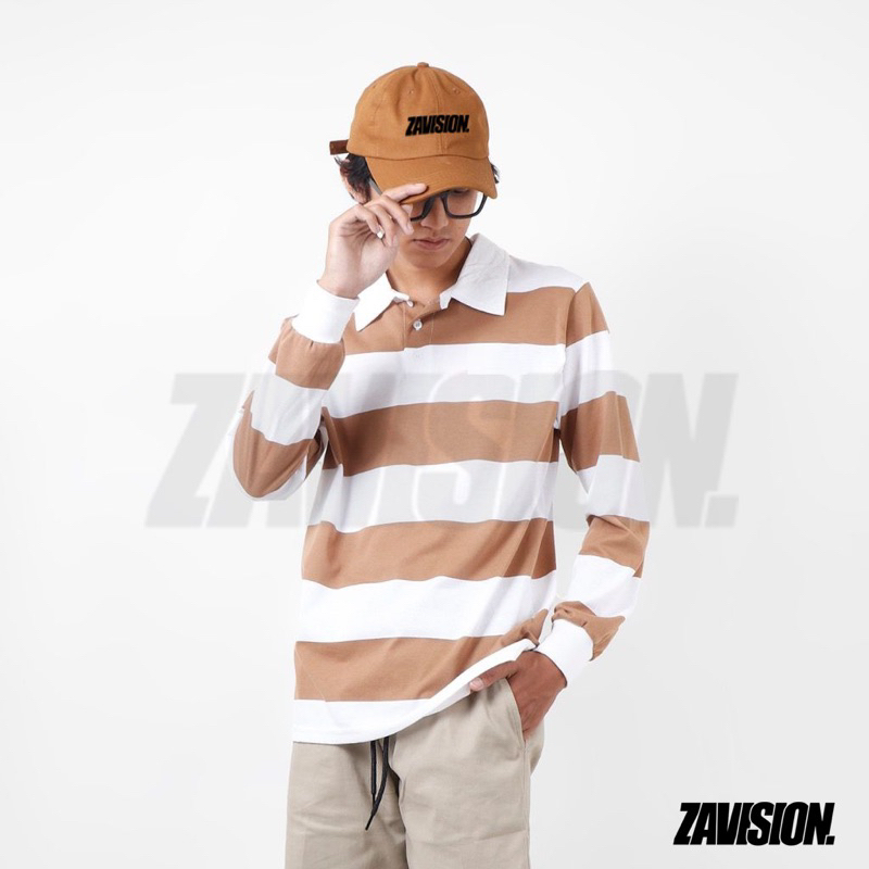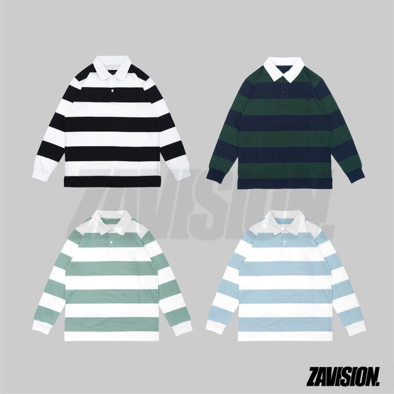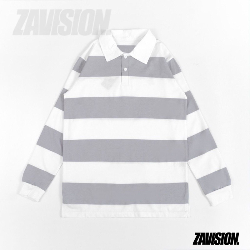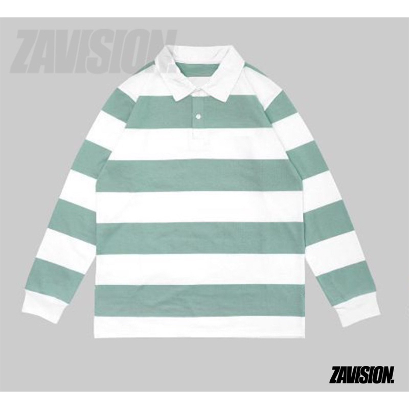 ZAVISION rugby tshirt polo kaos oversize pria wanita lengan panjang kaos kerah stripe kaos salur katun