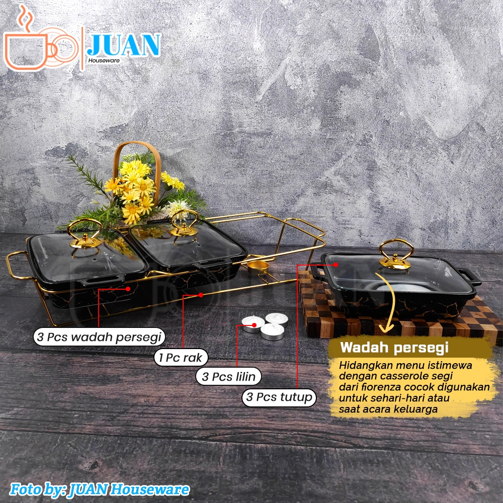 FIORENZA Prasmanan set segi isi 3 tutup kaca motif black marble + rak stainless chrome gold / food warmer square cassero