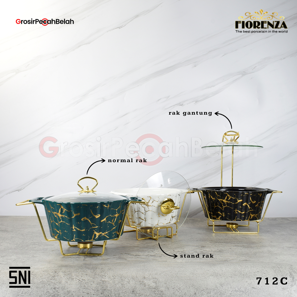 Fiorenza - Prasmanan Keramik Bulat Set Wadah Saji & Panci Penghangat Makanan | Motif Marble Embos Lining List Gold Mewah
