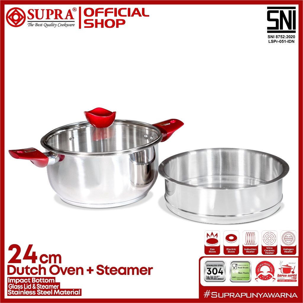 SUPRA Panci Stainless SUS 304 Dutch Oven dan Steamer 24 Cm - Red