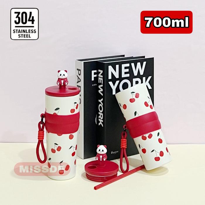 Tumbler 700ml Mug Stainless Steel / Gelas Minum Sedotan / Hot & Cold Mug Panda With Straw Lid - PANDA BLACK