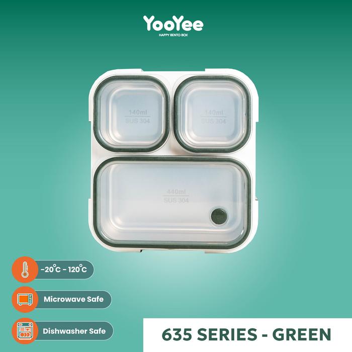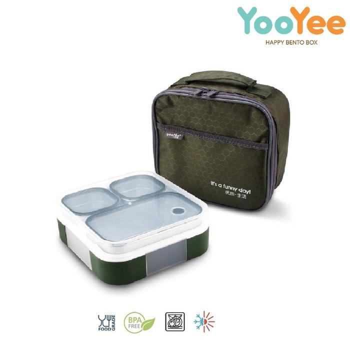 Yooyee Kotak Makan Stainless 3 Sekat Set dengan Tas 635 plastik steel Kitchenware - Hijau Army