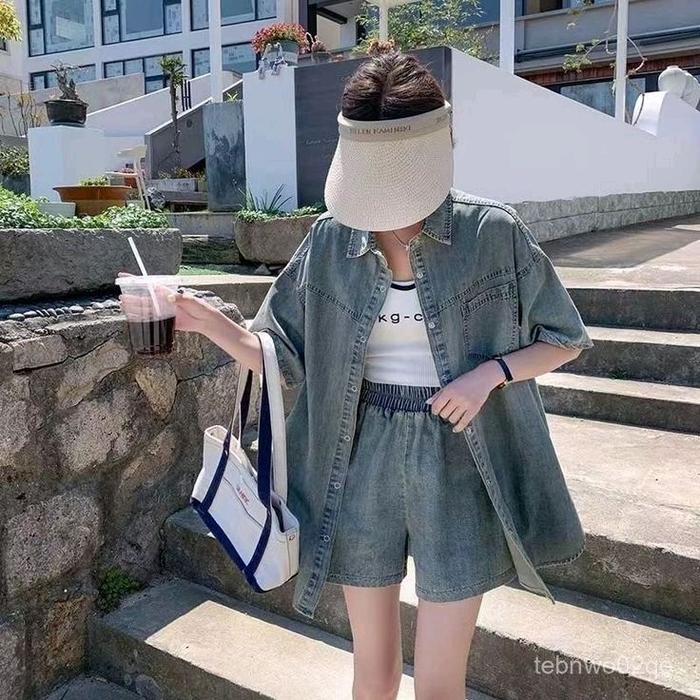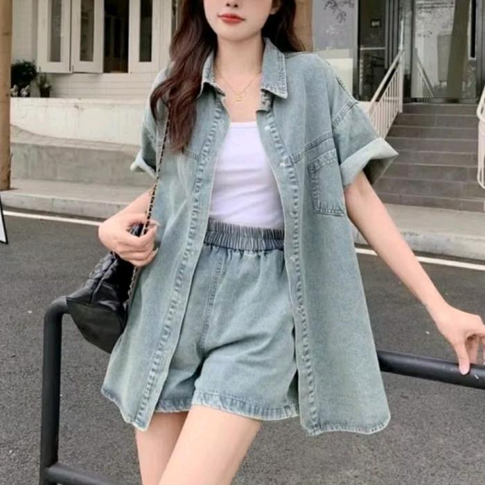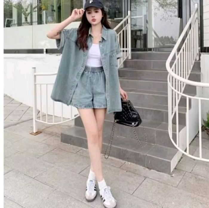 ELVIZA ONESET WANITA KEMEJA OVERSIZE DENIM RETRO CASUAL LONGGAR SETELAN WANITA OVERSIZE LD 120CM LP 70CM MELAR HINGGA 10