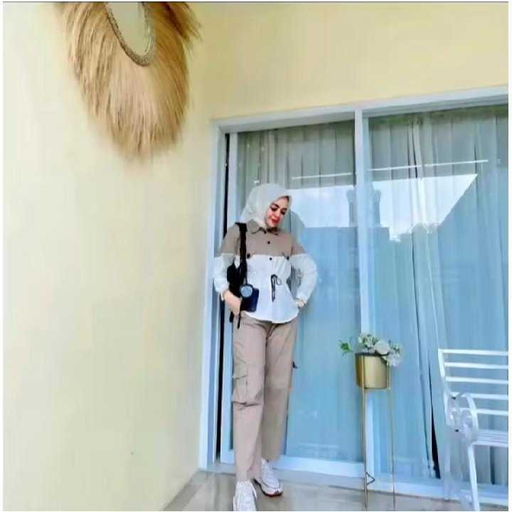 One Set Kemeja Kombinasi Kekinian Terbaru/BAJU WANITA SETELAN POLOS KOMBINASI SET CARGO LENGAN PANJANG CELANA PANJANG/Se