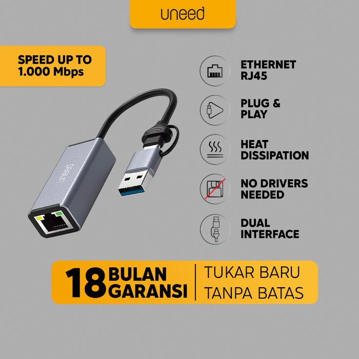 UNEED ADAPTER CONVERTER USB A 3.0 - TYPE C TO LAN ETHERNET RJ45 - 100MBPS
