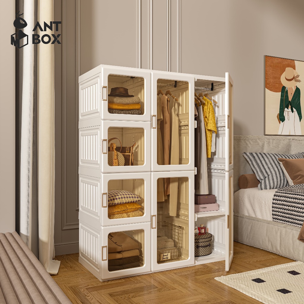 ANTBOX Lemari Baju Transparan 12 Box 2 Gantungan Baju Lemari Baju Minimalis Kabinet Lipat Serbaguna