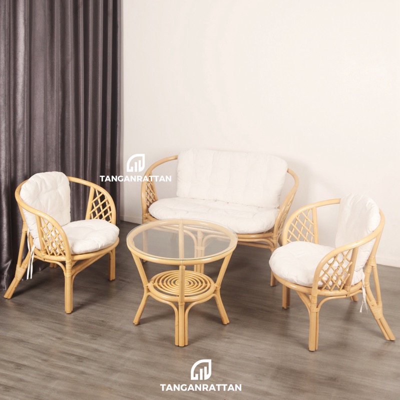 KURSI BAHAMA ROTAN GRATIS BANTAL DAN MEJA KACA 1 SET / KURSI TERAS TAMU ROTAN MINIMALIS