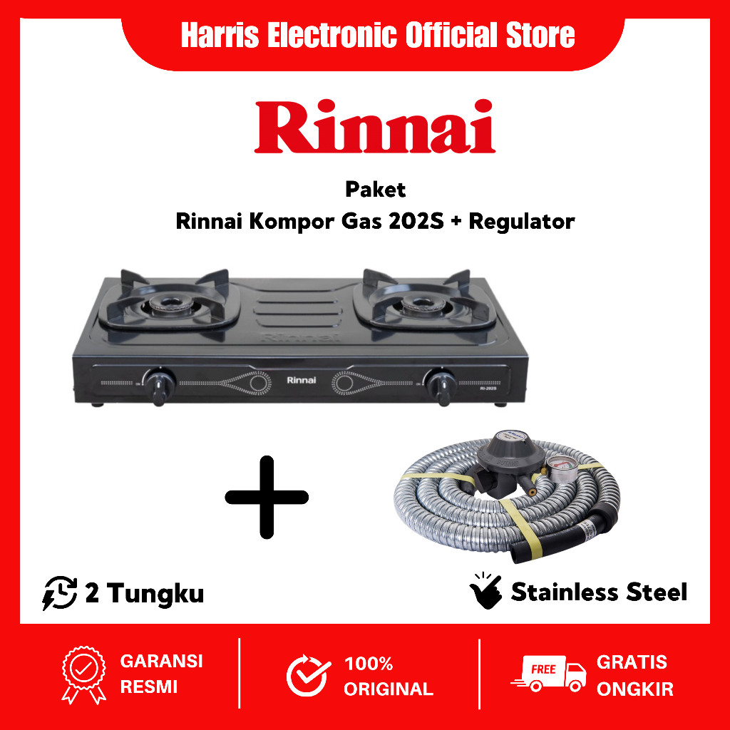 PAKET BUNDLING Kompor Gas 2 Tungku RINNAI RI 202S + RMS-206 M SELANG REGULATOR GAS MIYAKO SNI