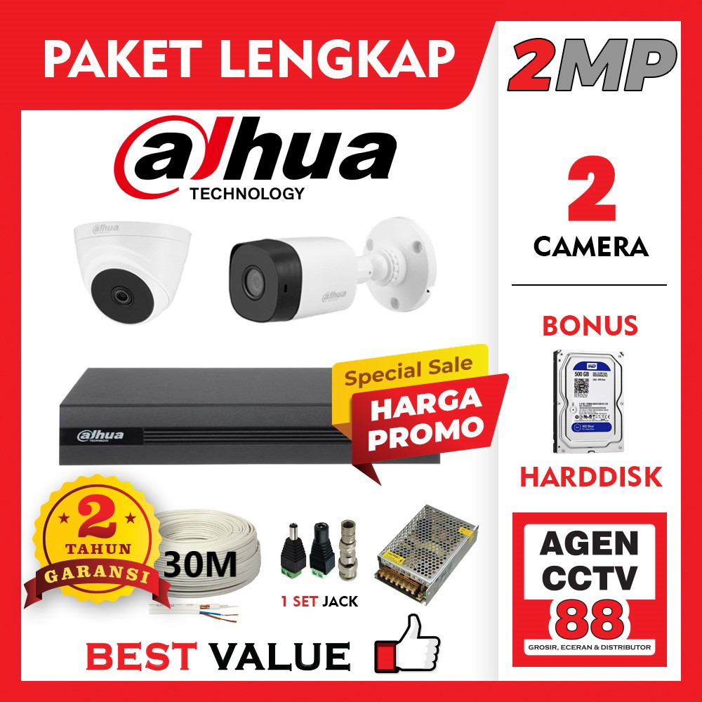 Paket CCTV DAHUA 2CH 2 Channel Kamera Full HD 2MP Lengkap + Kabel + Harddisk