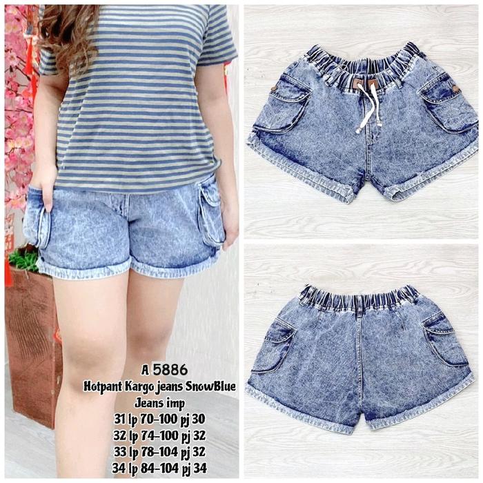 Celana Jeans Hotpants Cargo Snow Blue Pinggang Karet Tali Kaki Stik Size 27-34 Wanita Motif Kantong - Snow Blue 27