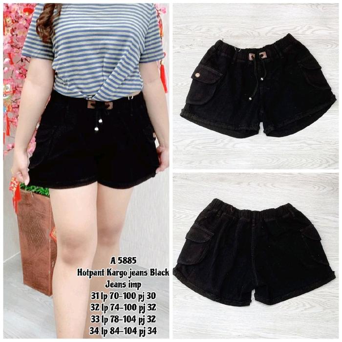 Celana Jeans Hotpants Cargo Black Pinggang Full Karet Tali Serut Size 27-34 Cewek Motif Kantong - Hitam 27