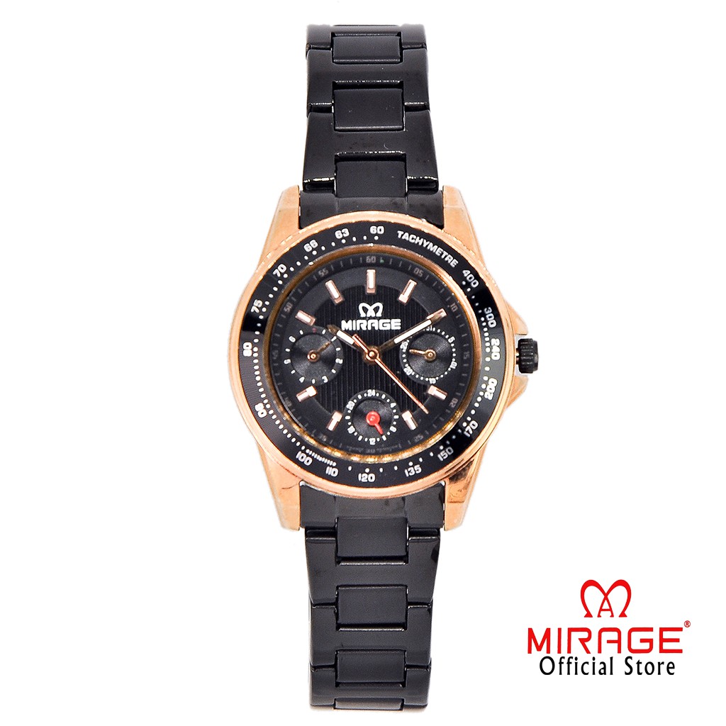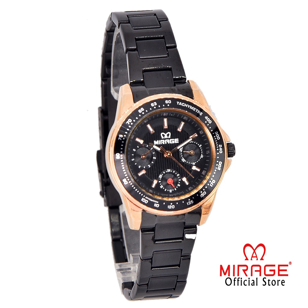 Mirage Jam Tangan Wanita Premium Chrono Aktif Hitam RoseGoll Analog 8589 L Stainless Steel Garansi
