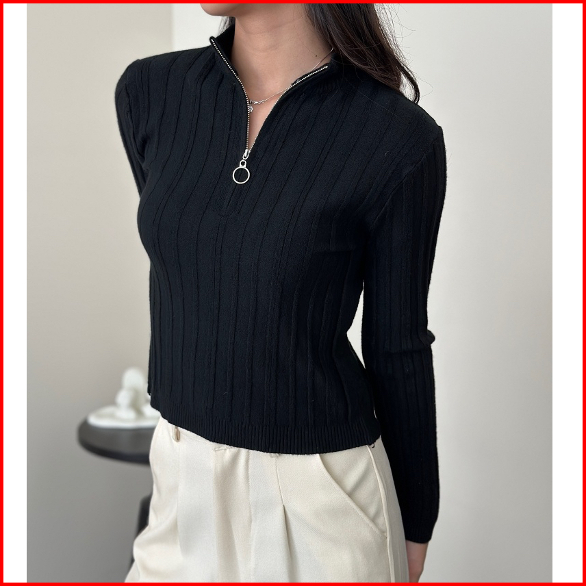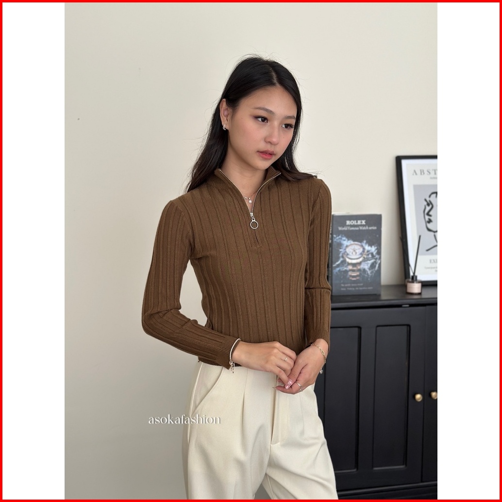 Asoka Avery Top 3144 - Half Zip Knit Crop Long Sleeve V Neck - Atasan Wanita Casual