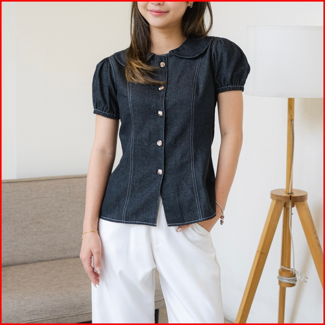 Asoka Lumora Top 2570 - Contrast Stitch Denim Shirt Short Puff Sleeve And Long Sleeve - Petter Pan Collar Top