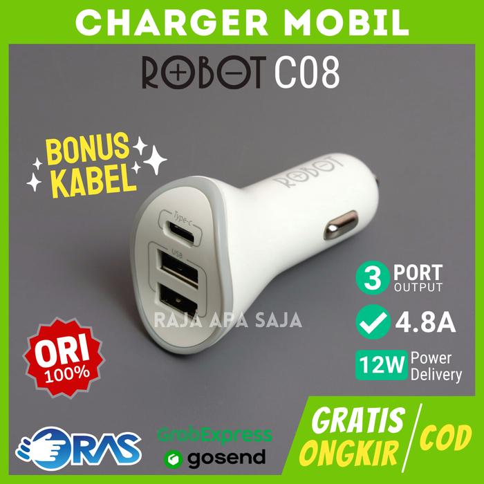 Car Charger Robot C08 Power Delivery Type C 3 Output 4.8A Fas Charging Casan Mobil Motor Kabel