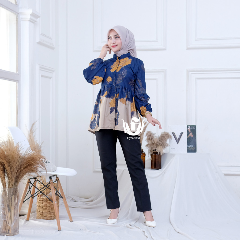 Atasan Baju Batik Wanita Jumbo Modern Blouse Kerja Lengan Balon M L XL XXL Murah Gratis Ongkir