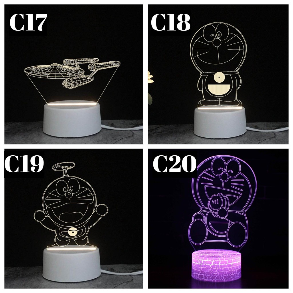 C1 TEDDY LOVE, C2 PATRICK, C3 BURUNG HANTU, C4 GITAR, C5 GLOBE BUMI, C6 POKEMON, C7 ANGSA COUPLE, C8 PUBG, C9 TEDDY BULAN, C10 KAMERA, C11 JAMUR, C12 3 BOLA, C13 MASJID, C14 LAFADZ ALLAH, C15 MARVEL GUARDIANS, C16 PARIS ATAU EIFEL, C17 UFO, C18 DORAEMON BERDIRI, C19 DORAEMON BALING, C20 DORAEMON DUDUK, LAMPU TIDUR JAMUR, TATAKAN LAMPU 3D