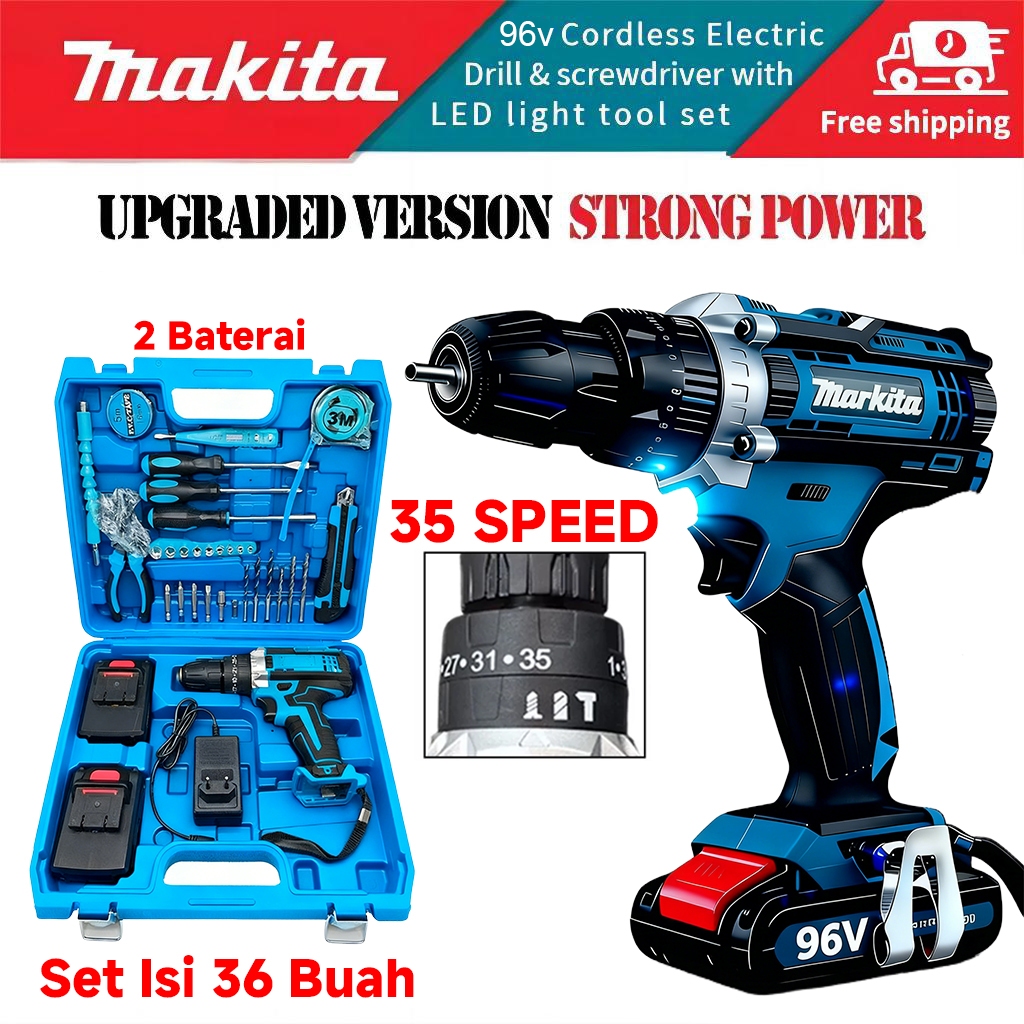 MAKlTA 96V Mesin bor 2baterai cas 10mm bor listrik murah bor tangan baterai besi tembok Beton kayu Cordless Drill bor cas