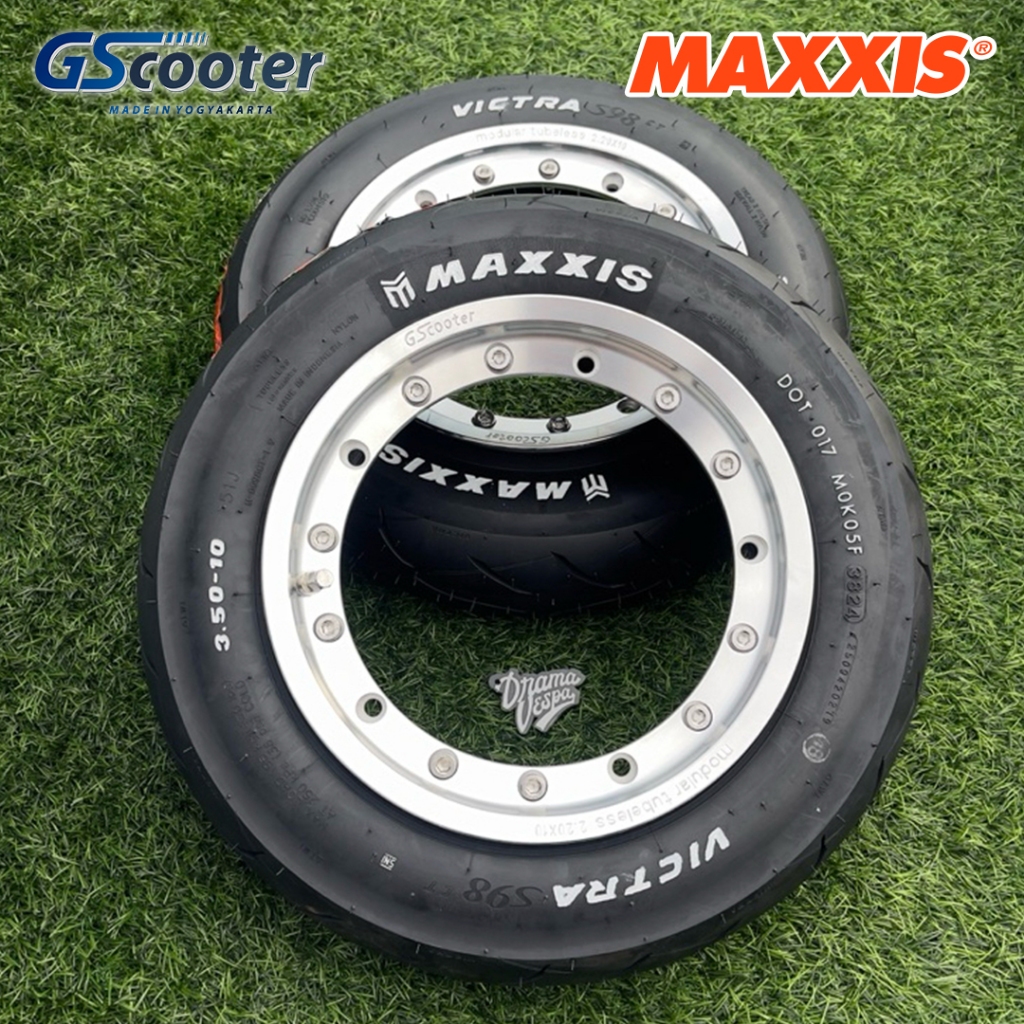 Velg Vespa Modular Polish GScooter ring 10 dan Ban Tubeless 350-10 Maxxis S98 Victra White Text | Drama Vespa