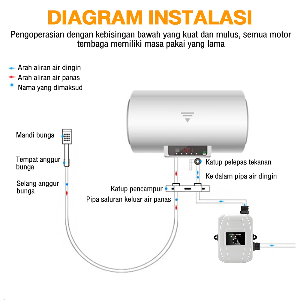 250W Pompa Booster Pendorong Air Otomatis 45L/min untuk Shower Water Heater dan Mesin Pendorong Air