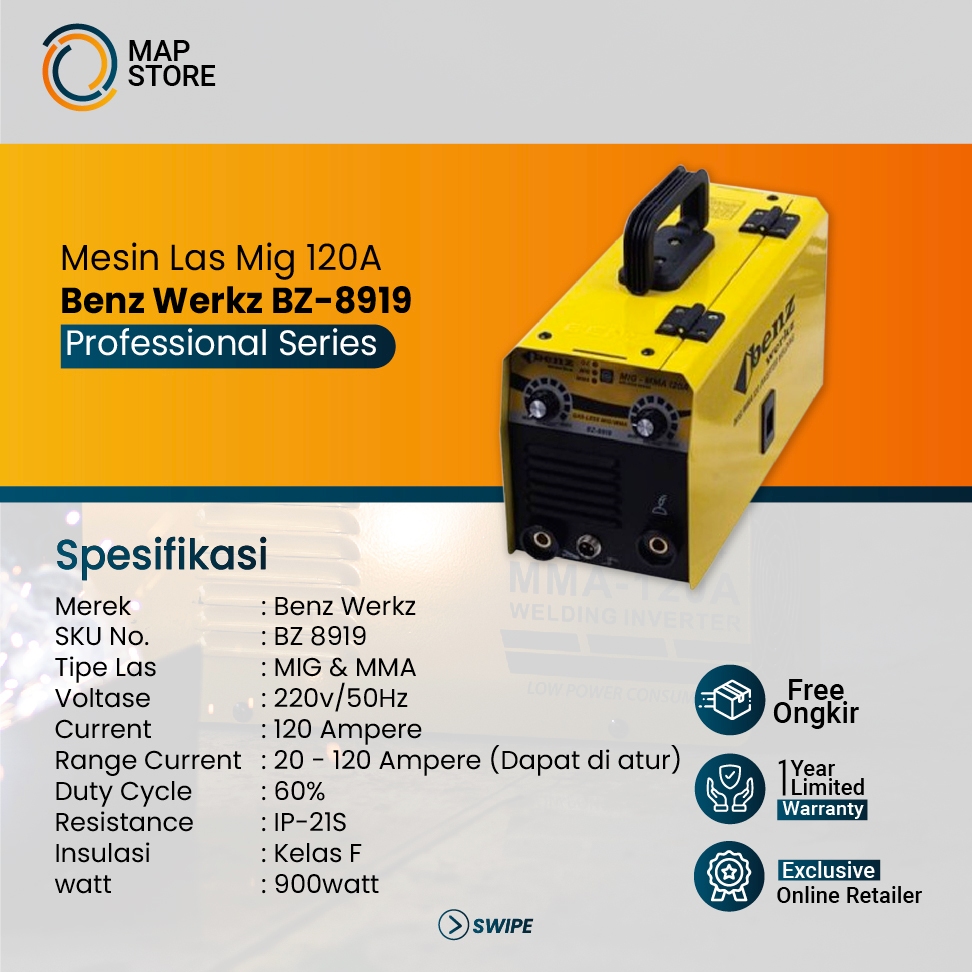 Mesin Las Mig 120A Tanpa Gas Co2 Flux Core Benz Welding Gasles Bz 8919