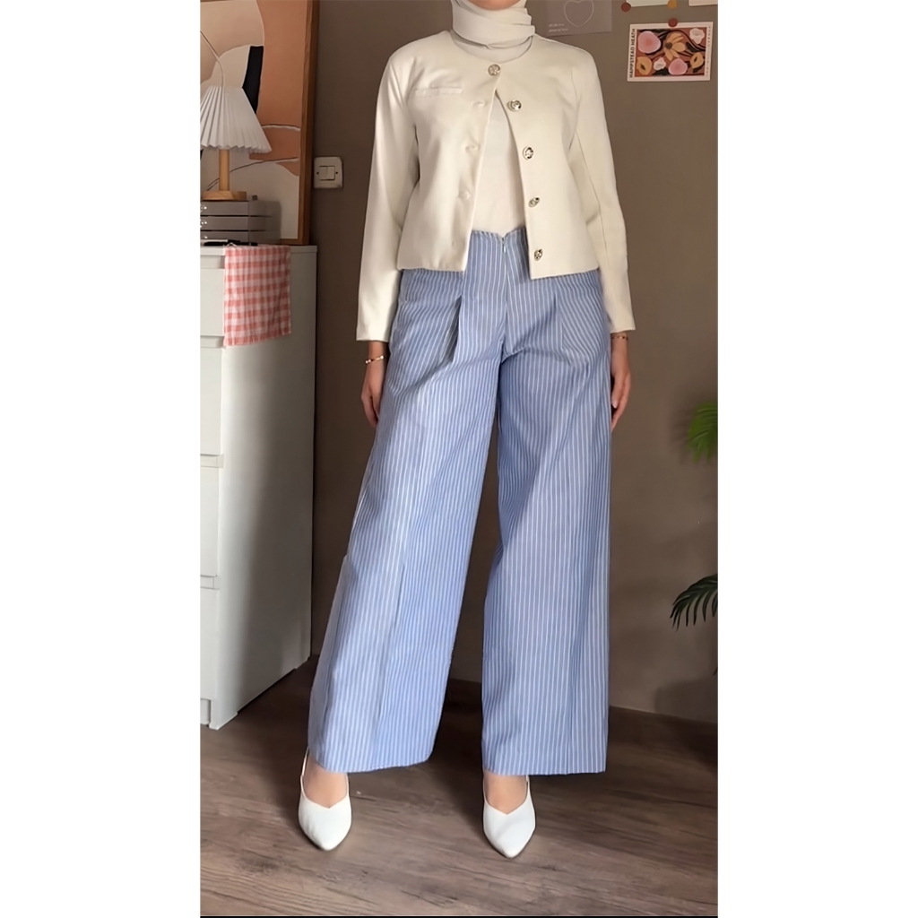 Betweeen - Stripe Pants Celana Panjang Wanita Wideleg City Pants Motif Salur Belakang Karet Celana Kulot Celana Kerja Ha
