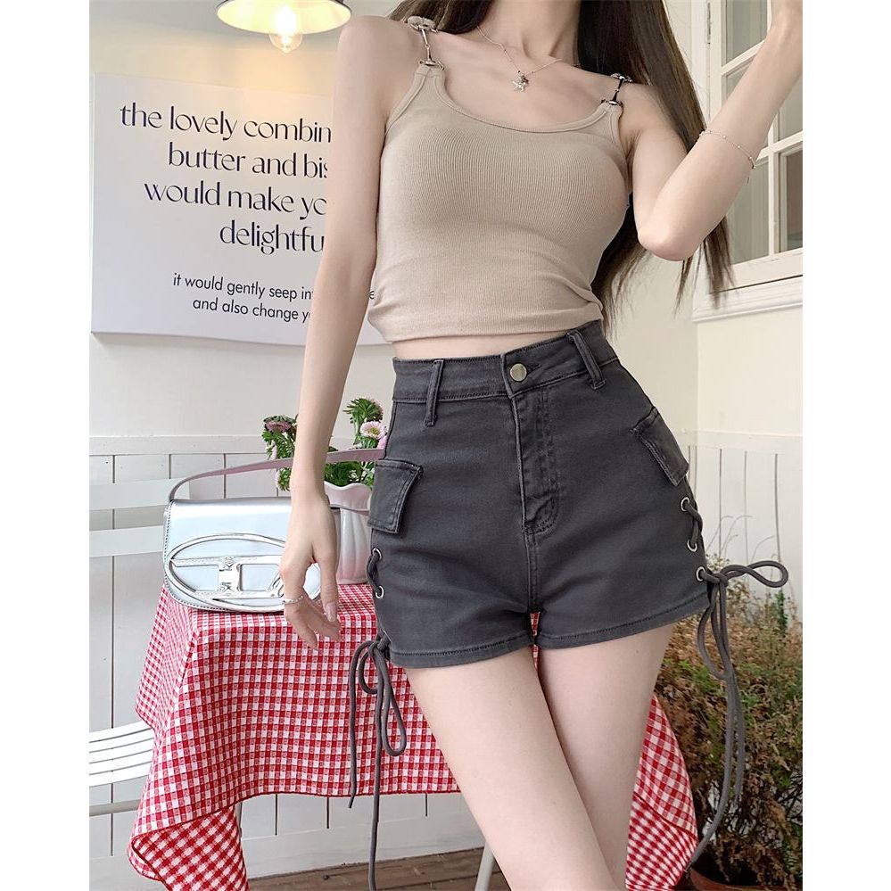 Celana Pendek Denim Pinggang Tinggi Gaya Korea Untuk Wanita Celana Pendek Kargo A-Line/Celana Pendek Ramping Deng