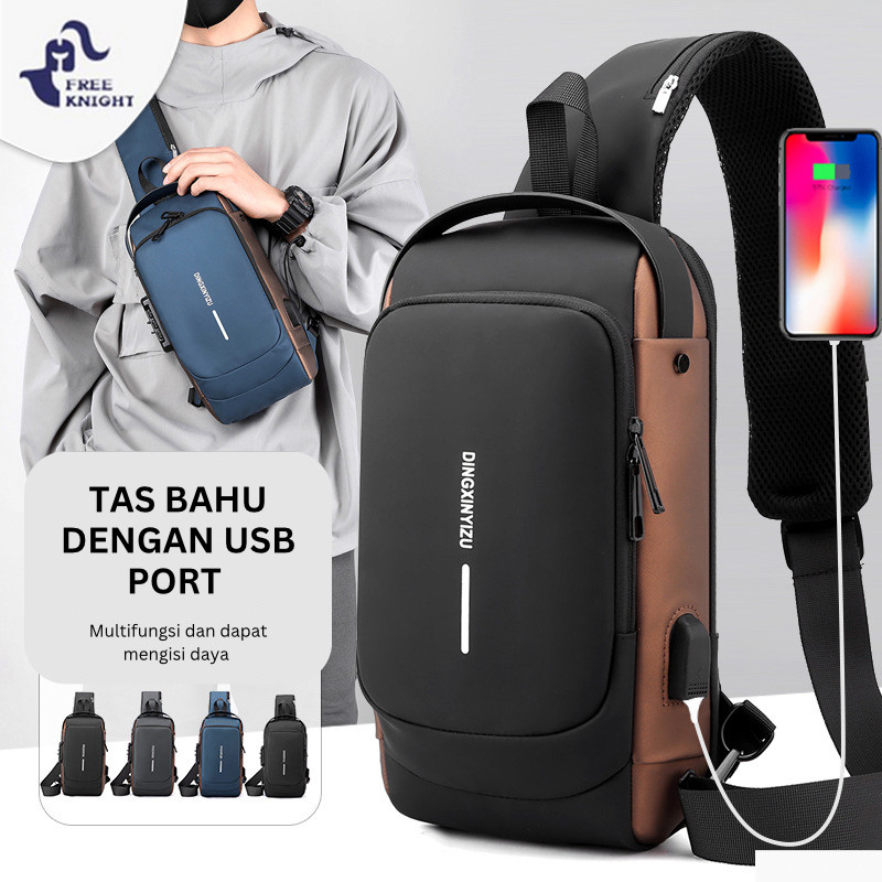 Tas Selempang Pria Multifungsi / Tas Dada / Tas Bahu USB Charger Anti Maling Waterproof dengan Kunci Kombinasi, Stylish untuk Kerja & Travelling