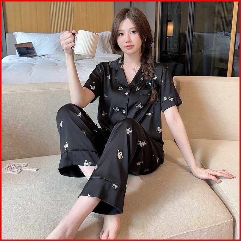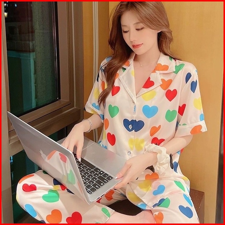 Set Piyama Wanita Satin Premium - Langsing Lengan Pendek Celana Panjang Motif Eksklusif Baju Tidur Nyaman Untuk Rumah Da