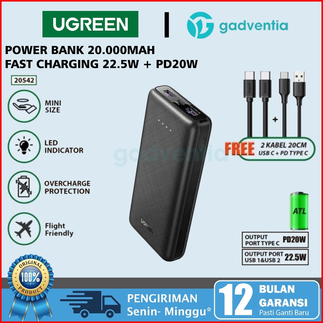 Ugreen Powerbank Atl Batterai Mfi Iphone Samsung 10000mah 20000mah Fast Charging Max 22.5w Kabel Usb C