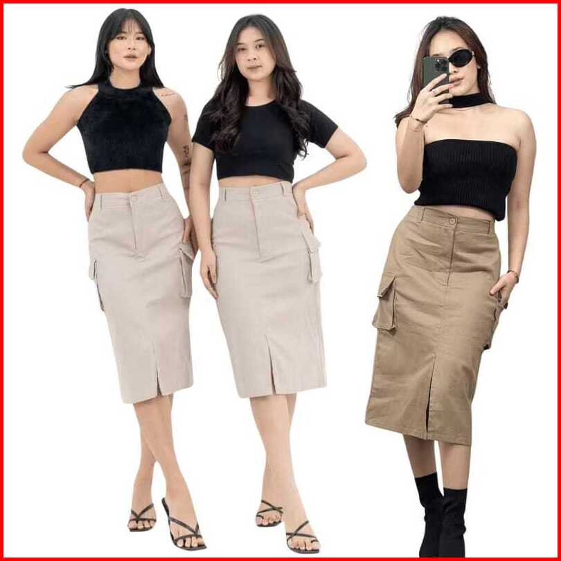 Skirt Cargo Highwaist Cassia Skirt Midi 7 8 Karet Belakang Rok Kargo Wanita Basic Korean Style
