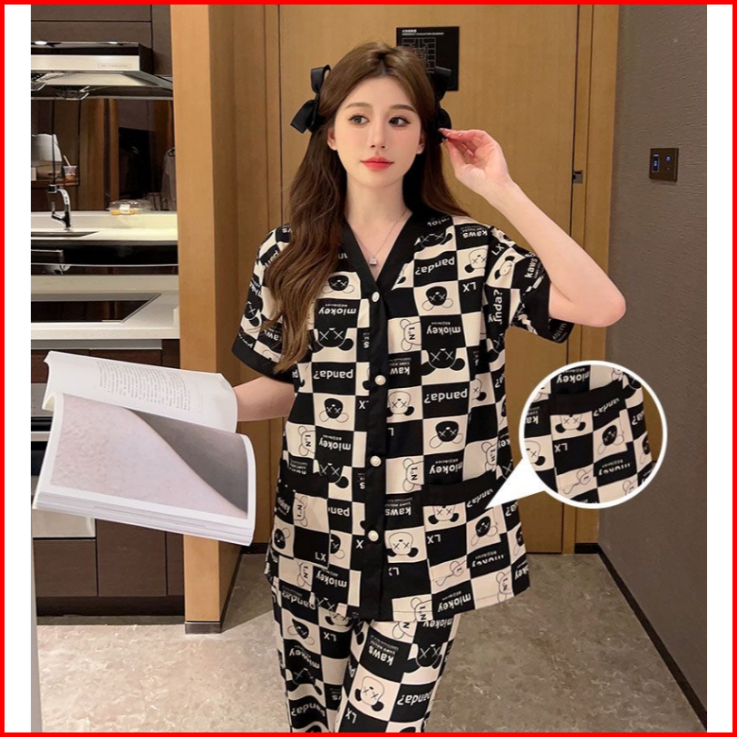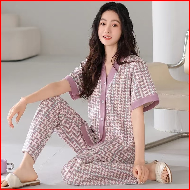 Setelan Tidur Wanita Lengan Pendek Longpants Pakaian Rumah Elegan Daster Baju Tidur Wanita Baju Tidur Piyama Tidur Wanit