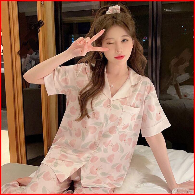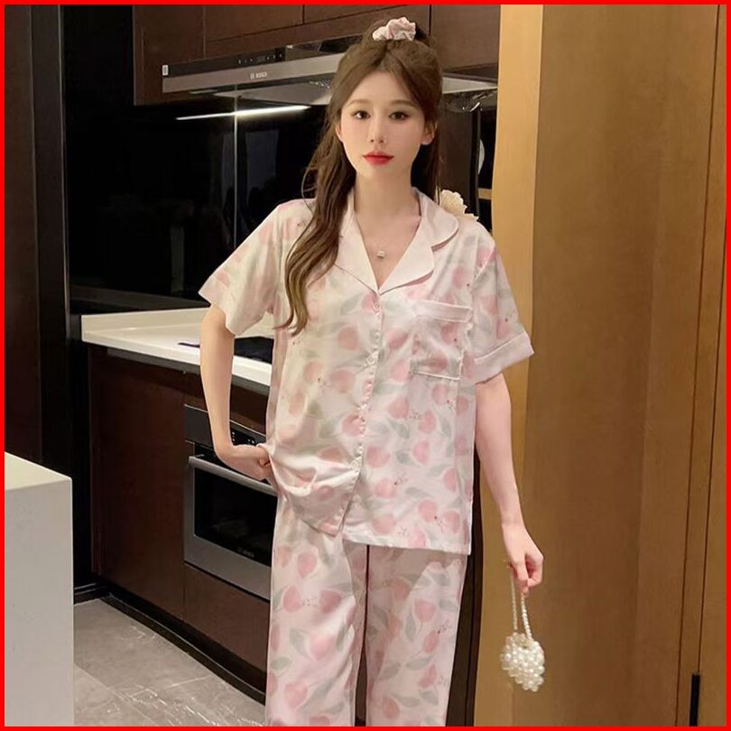 Sleebee Pakaian Tidur Wanita Modern Setelan Tidur Floral Pastel Warna Hijau Muda Bordir Kuning Ruang Santai Minimalis Ba