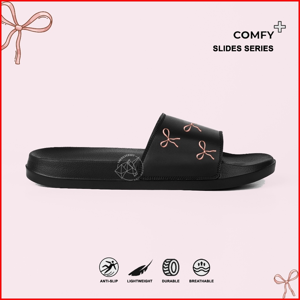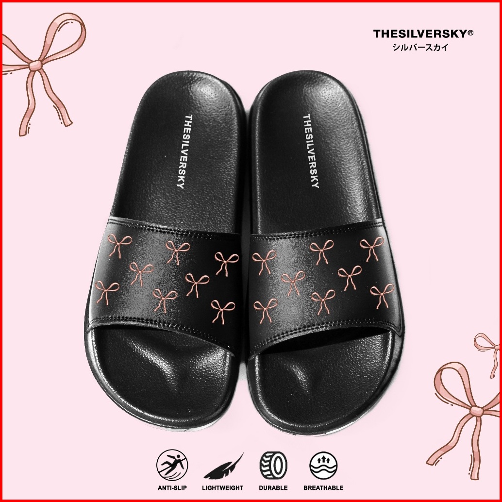 Thesilversky Ribbon Slides Sandal Slip On Wanita Premium Hitam