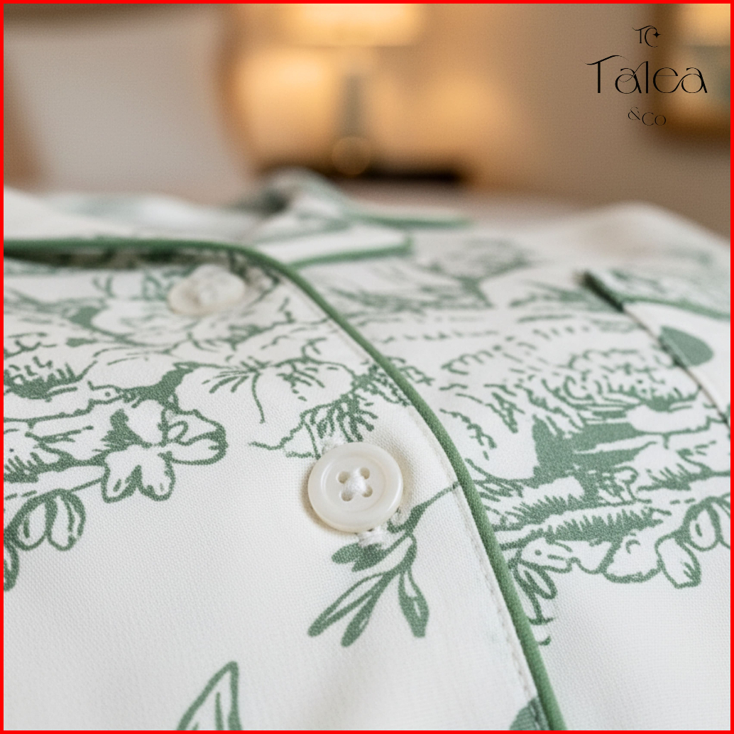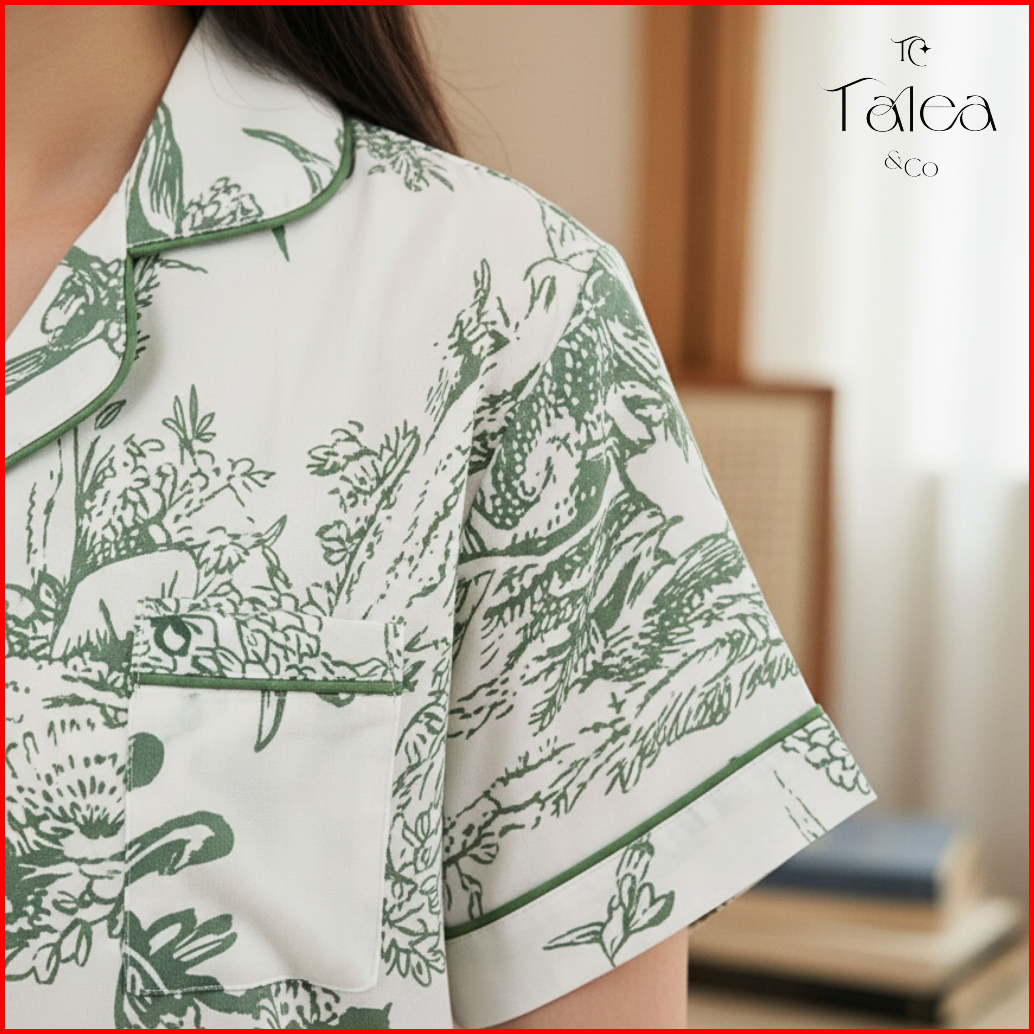 Talea Co - Piyama Wanita Organic Silk Baju Tidur One Set Motif Bunga - Forest