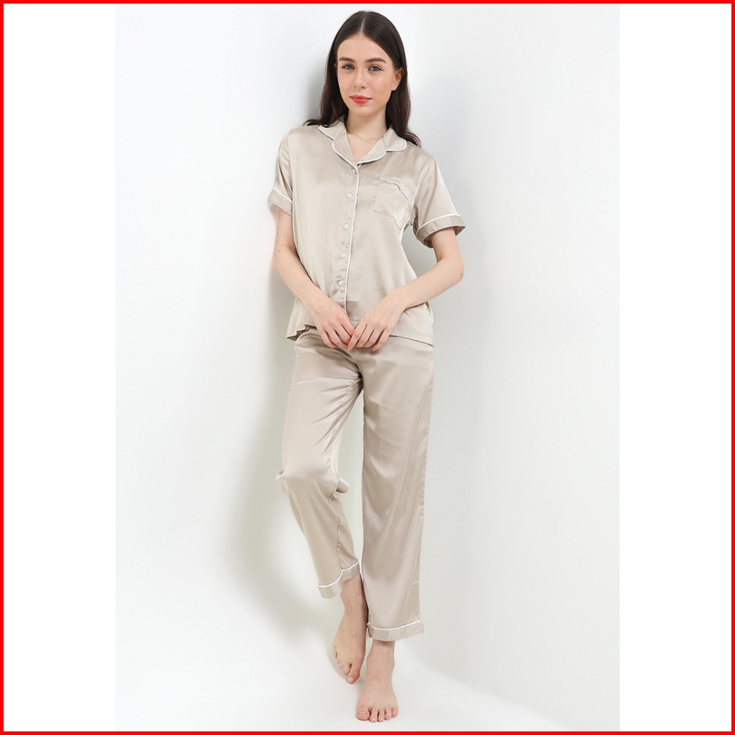 Set Pyjama Ladies Sleepwear 296 Satin Beige Lengan Pendek Celana Panjang 52502 32038 T Pajamas Baju Tidur Wanita Kancing