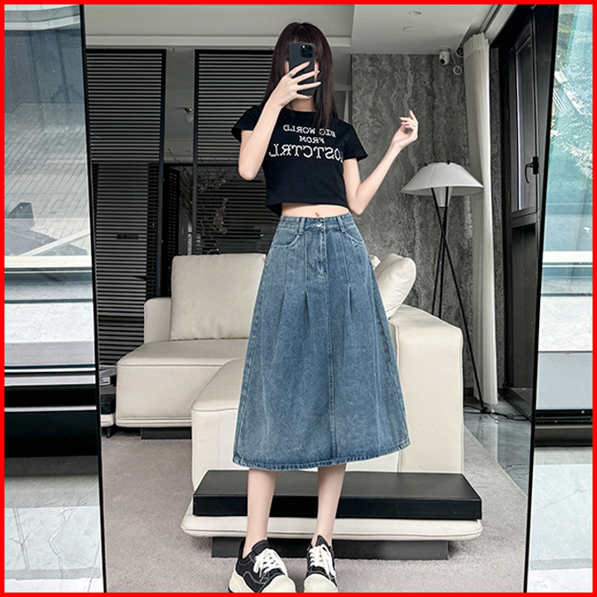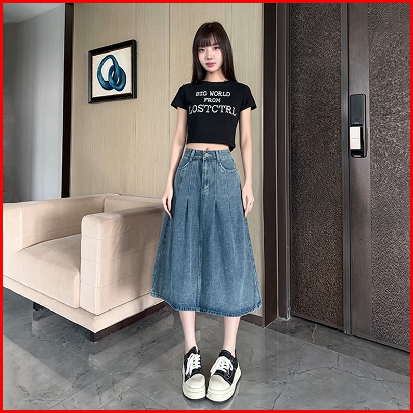 Rok Jeans Vintage Cucian Korea Rok Midi Lipit Pinggang Tinggi Rok Payung Jeans Wanita Pinggang Tinggi Gaya Penampilan Ka
