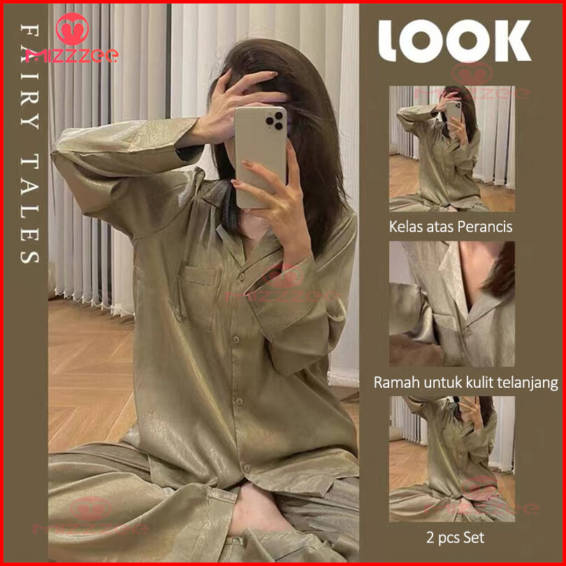 Mizzzee - Piyama Sutra Set Sutra Es Tie-dye Piyama Wanita Sutra Lengan Panjang Celana Panjang Cardigan Pakaian Rumah Lon