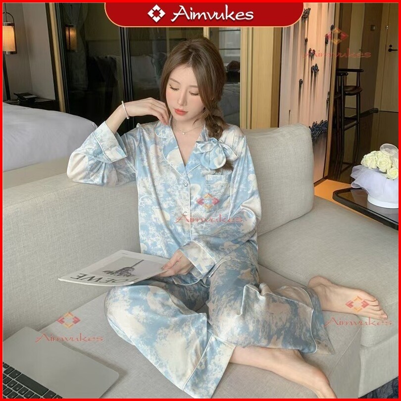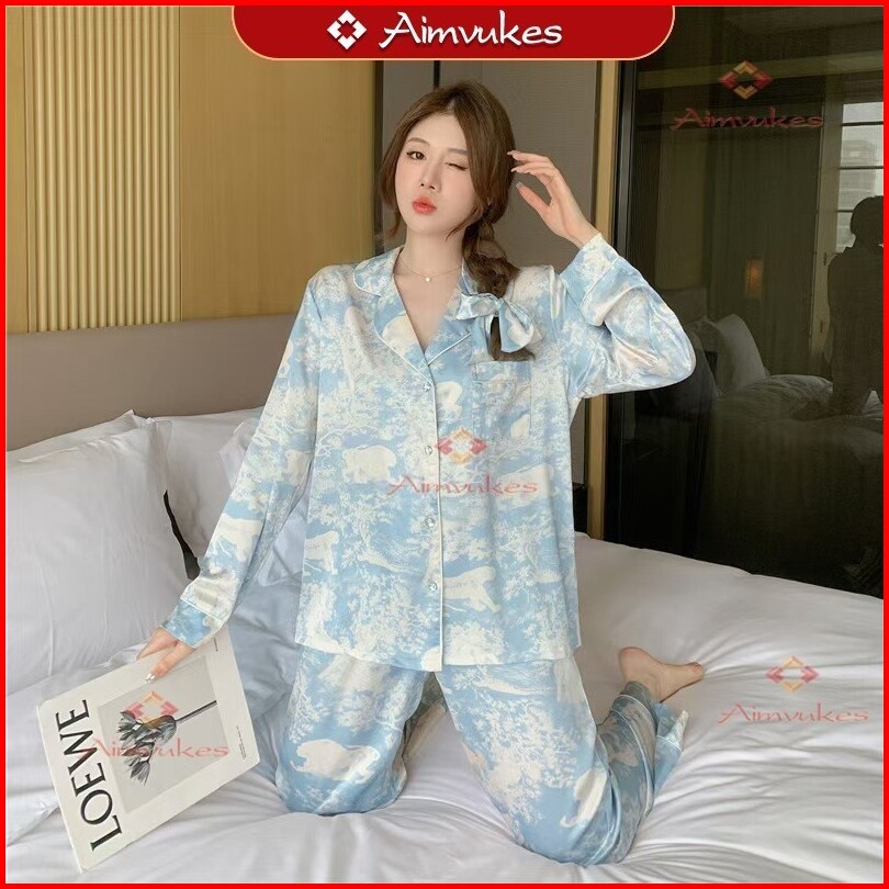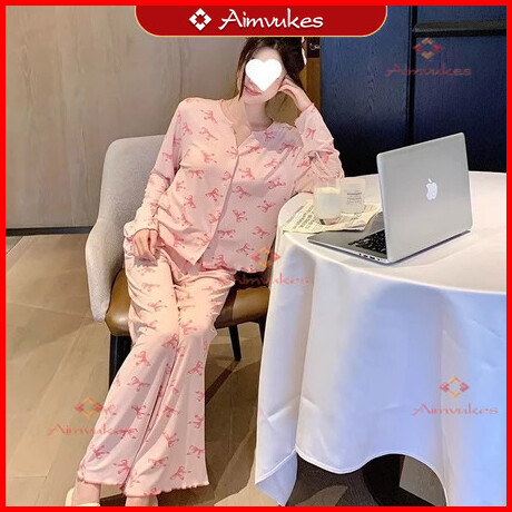 Aimvukes--2025 Versi Korea Baru High-end Es Sutra Lengan Panjang Celana Piyama Wanita Set Pakaian Rumah