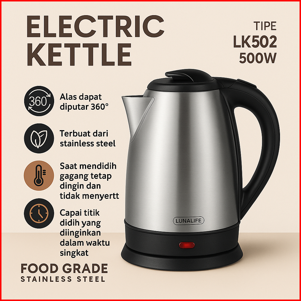 Luna Teko Listrik 2 Liter Sni 500 W Stainless Steel Pemanas Air Electric Kettle Ketel