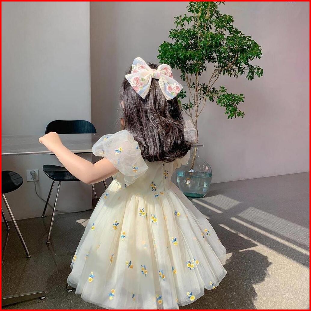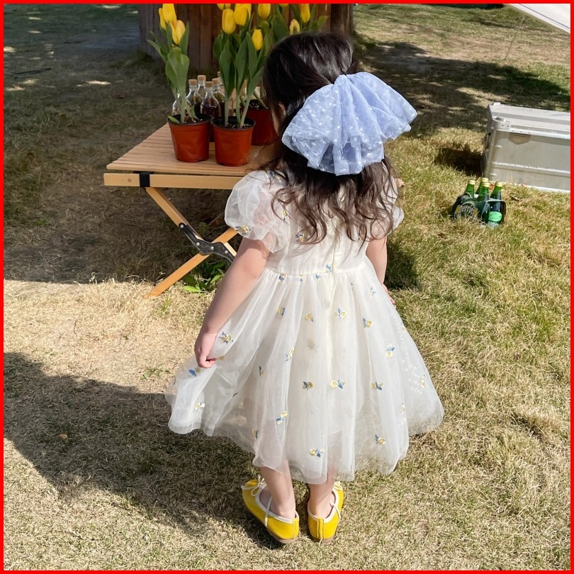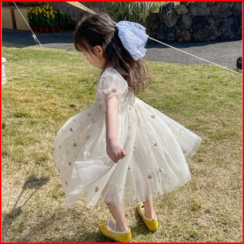 Sweetie Bloomgaun Anak Perempuan Bordir Bunga Kuning Dan Kupu Kupu Biru Lengan Gelembung Rok Jaring Berlapis Warna Krem