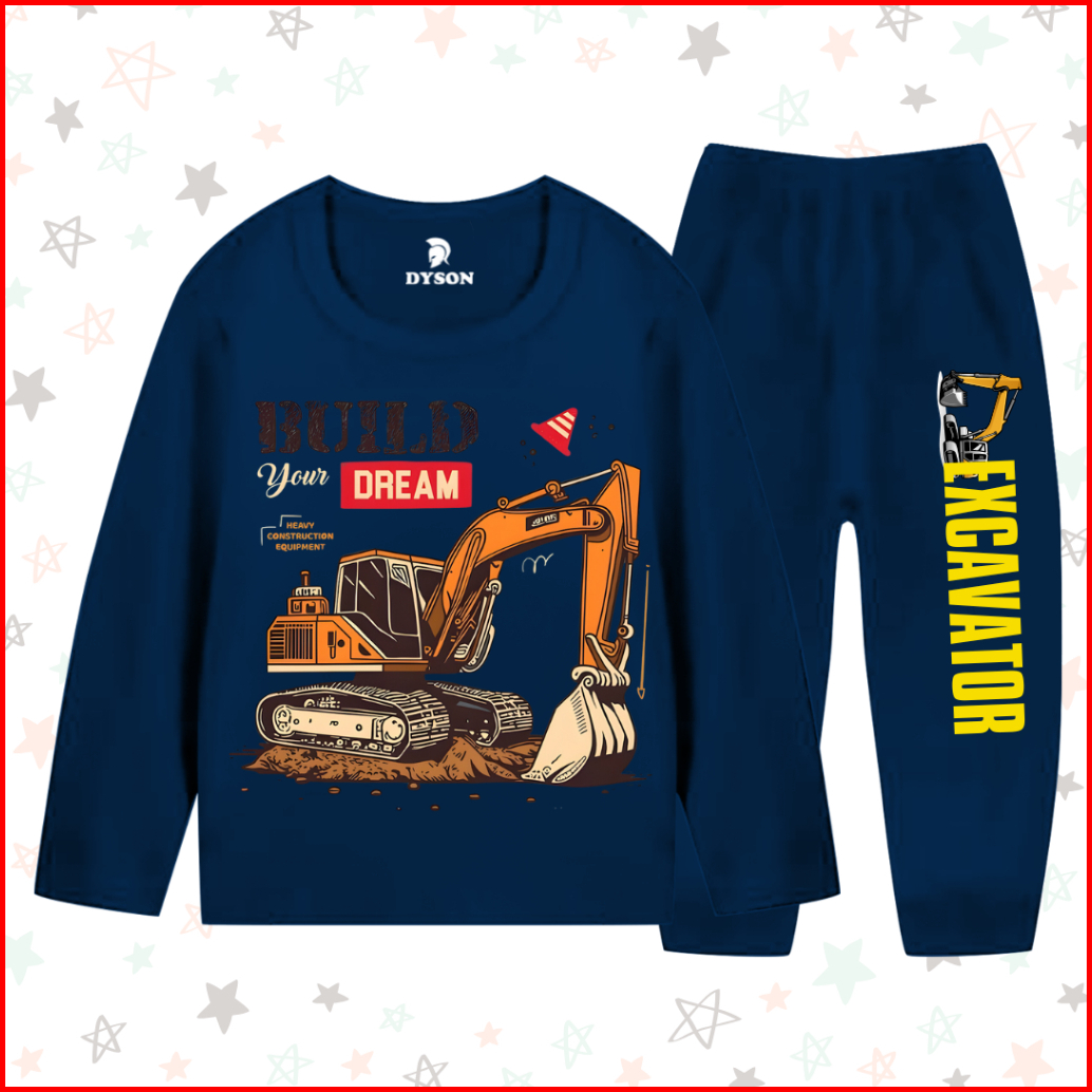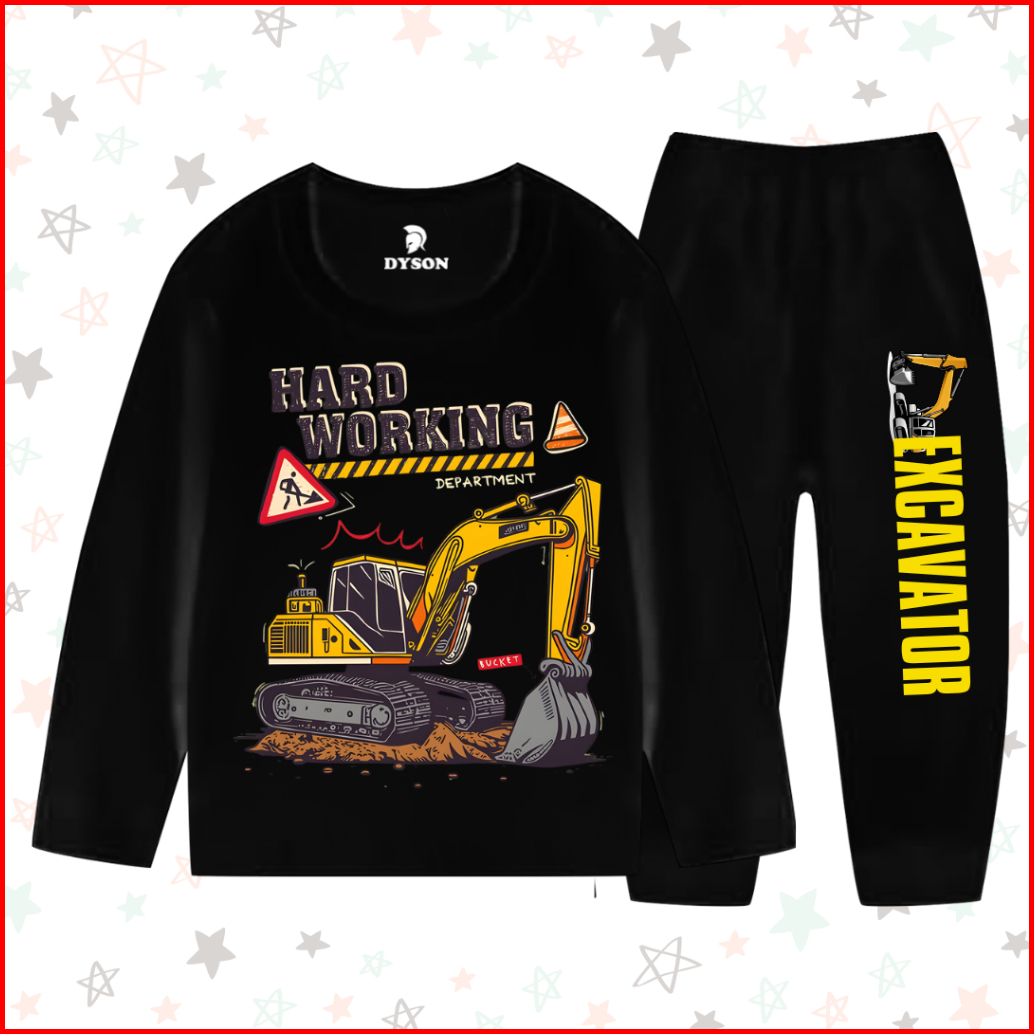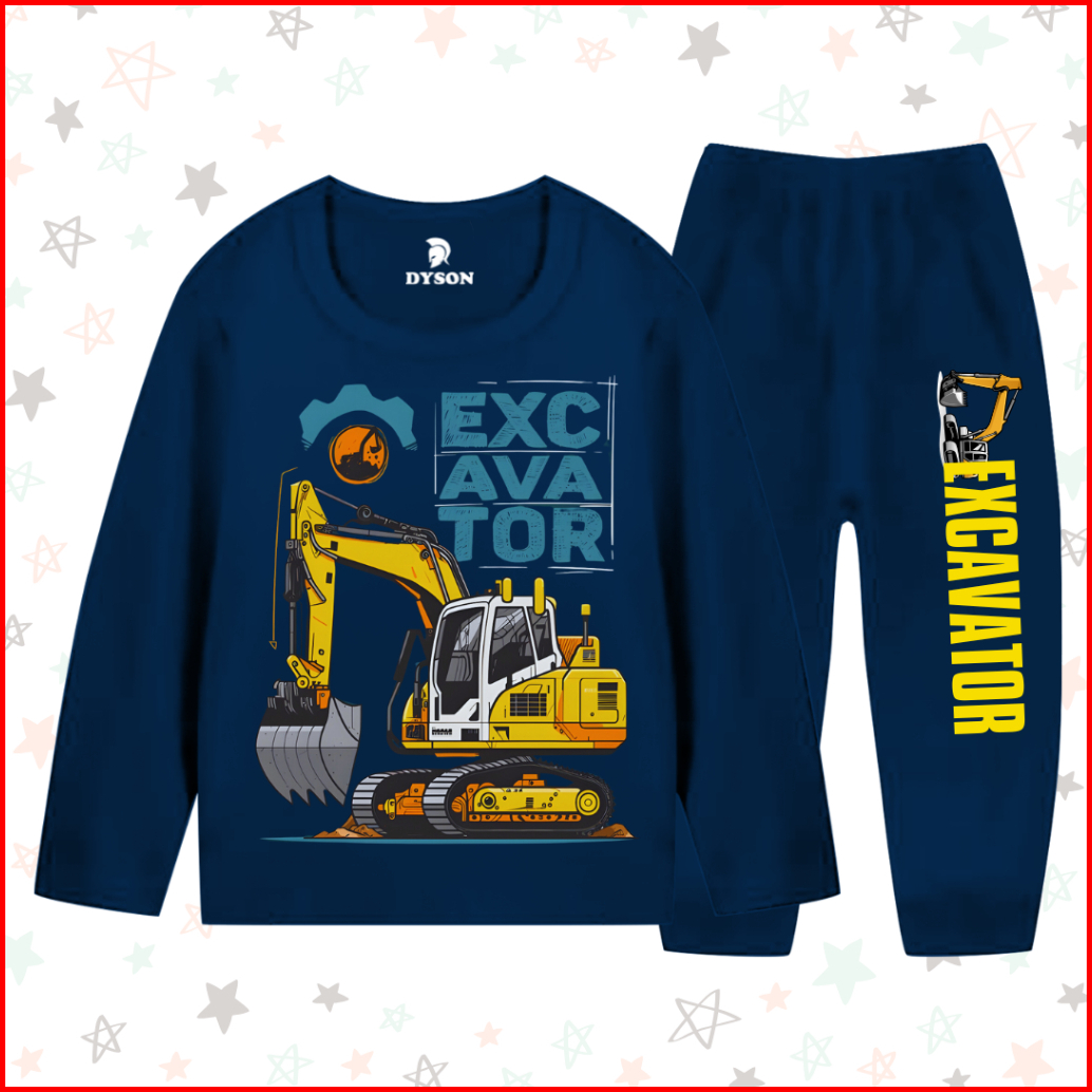 Baju Piyama Setelan Anak Laki Gambar Truk Excavator Cowok Lengan Celana Panjang Keren 1 - 10 Tahun